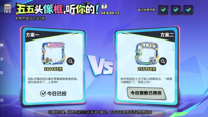 在近期,官方开启了一个活动,这个活动名为“五五头像框,听你的”活动,这个活动时间是从4月8号~4月12号,这个活动的主要内容就是从2款头像框中,选择一款你喜欢的头像框头像,最后票数多的那个头像框形象,会在五五开黑节作为免费资源赠送给玩家。