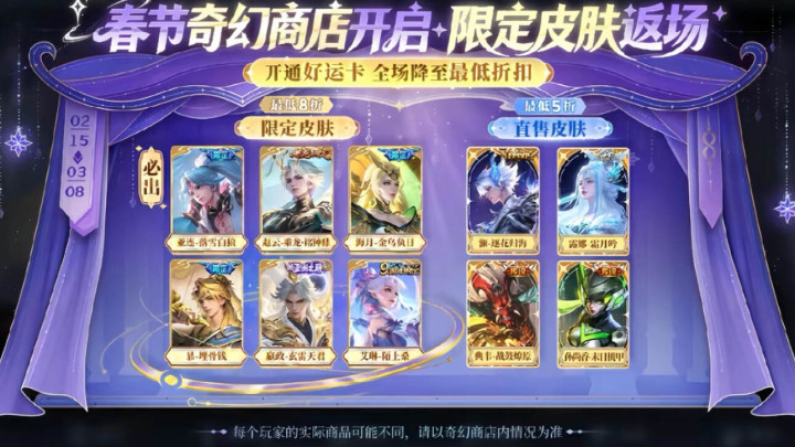 然后除了蔷薇珍宝阁这个活动之外,奇幻商店在这个期间也会返场。这个商店的直售皮肤,玩家最低可以用5折入手,限定皮肤则是8折。