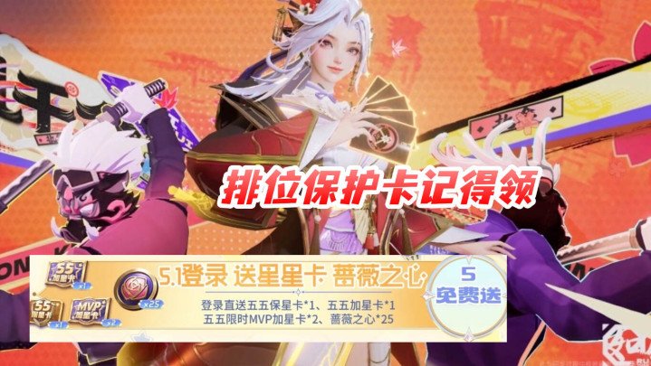最后就是除了赠送蔷薇之心和头像框之外,在5月1号当天登录游戏,还有额外的福利赠送给大家,比如五五保星卡、五五加星卡还有五五限时MVP加星卡,都是比较不错的,如果玩家打游戏,基本上是可以一句加几颗星的,非常的划算。