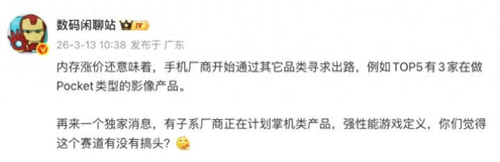 上个月,博主@数码闲聊站 的一份爆料中提到:“内存涨价还意味着,手机厂商开始通过其它品类寻求出路,例如TOP5有3家在做Pocket类型的影像产品。”