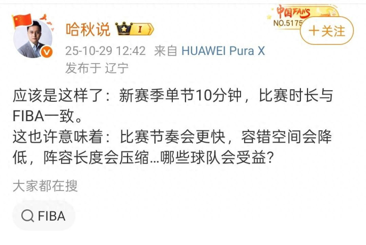 而就在不久,CBA联赛传来一个重大消息,据辽宁媒体人哈秋透露,新赛季将采取每节10分钟的比赛时长赛制,这也算得上是与国际接轨。