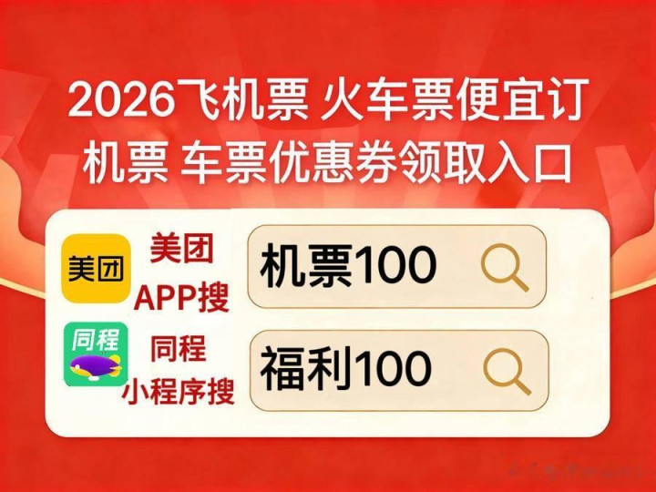 1.机票福利:打开同程APP/小程序搜【福利100】,领机票新人大额券包,仅限新注册账号,老号无此福利,最低100元起!券包含无门槛立减、满减券,春运热门航线都能用,叠加其他福利更划算;