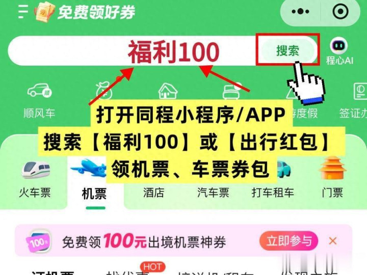 1.领券:同程先搜【福利100】领新人无门槛大额春运券包,再回到同程首页点“机票”