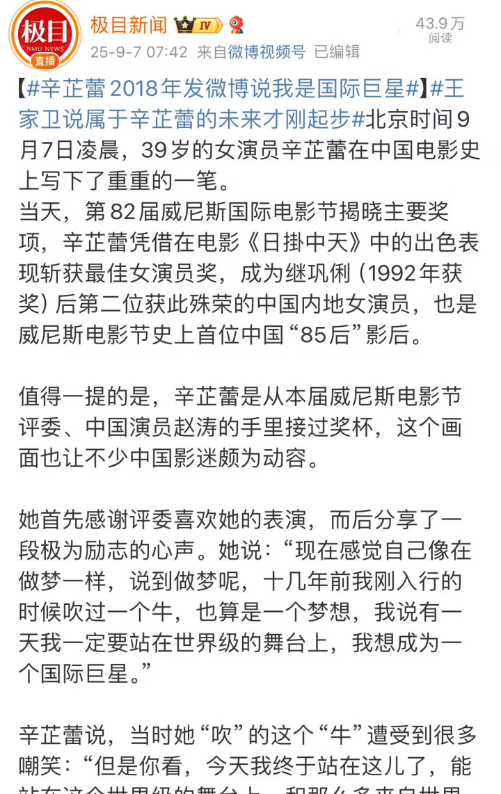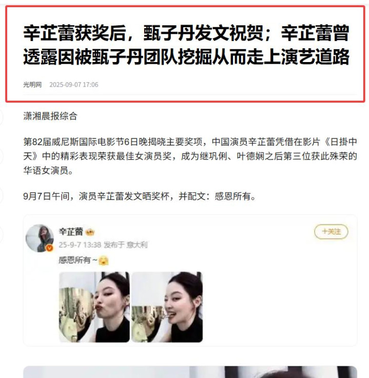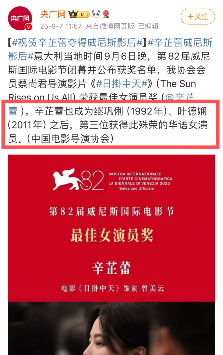 央视新闻不仅第一时间发布了辛芷蕾获奖的消息。