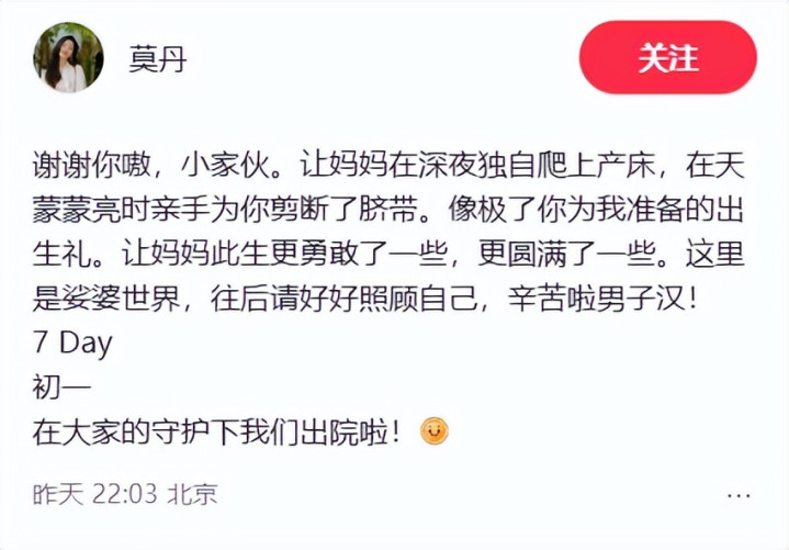 刚刚生产的莫丹,发文报喜讯,喊话儿子“谢谢你嗷,小家伙。让妈妈在深夜独自爬上产床,在天蒙蒙亮时亲手为你剪断了脐带。”莫丹坦言儿子的来临让她更勇敢、更圆满了一些,在这娑婆世界往后请好好照顾自己,辛苦男子汉。