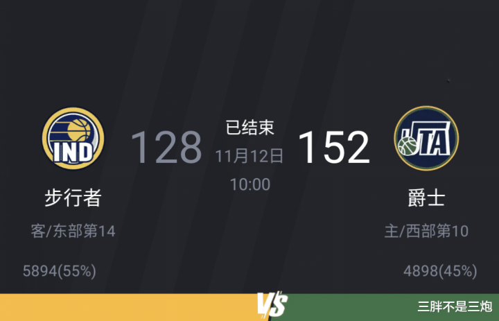 印第安纳步行者128:152 犹他爵士